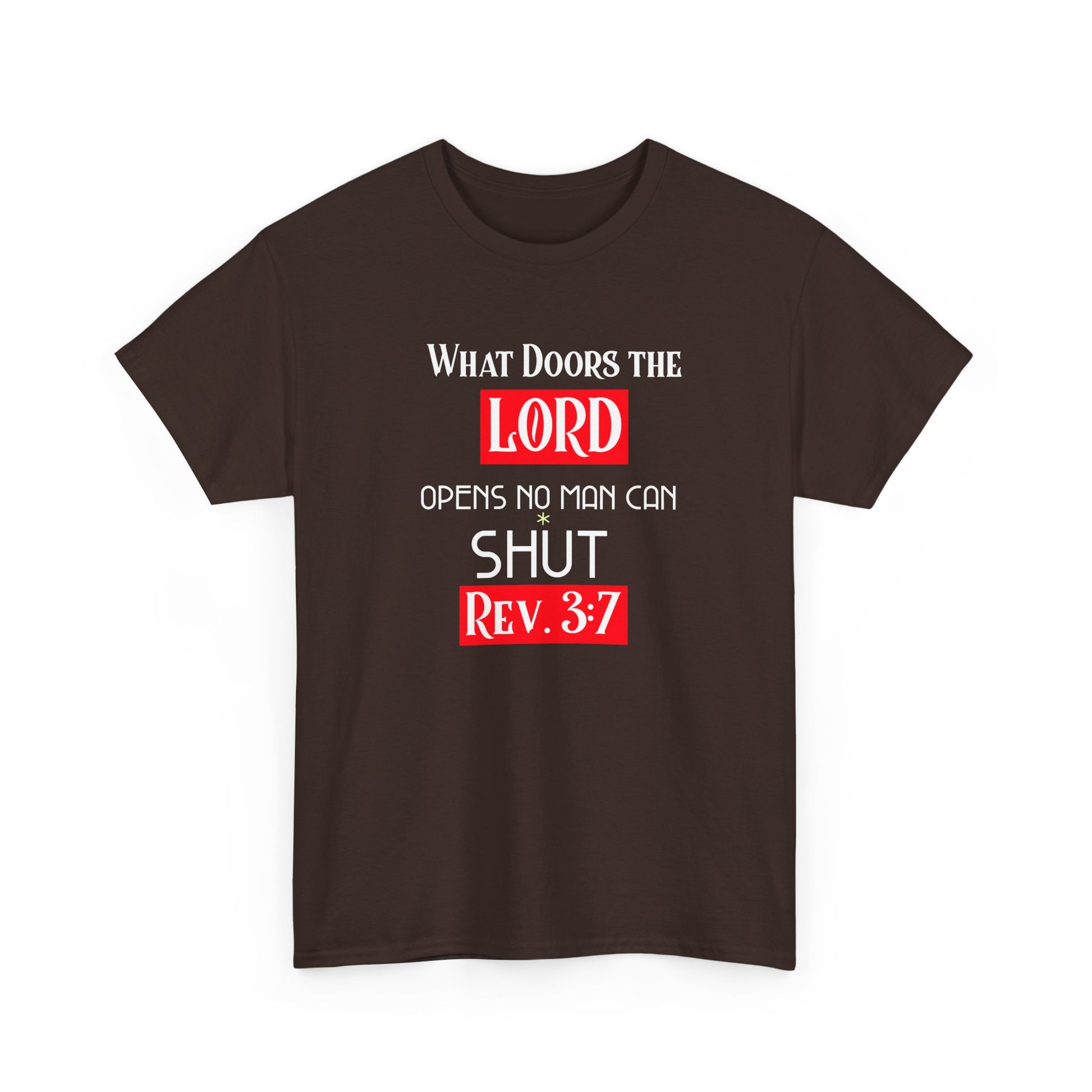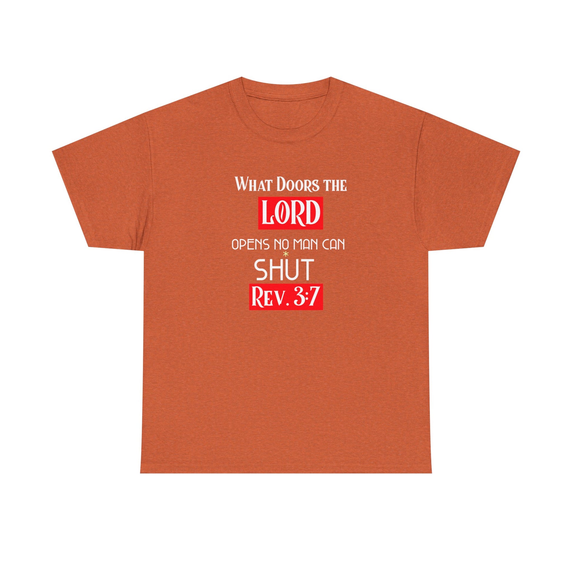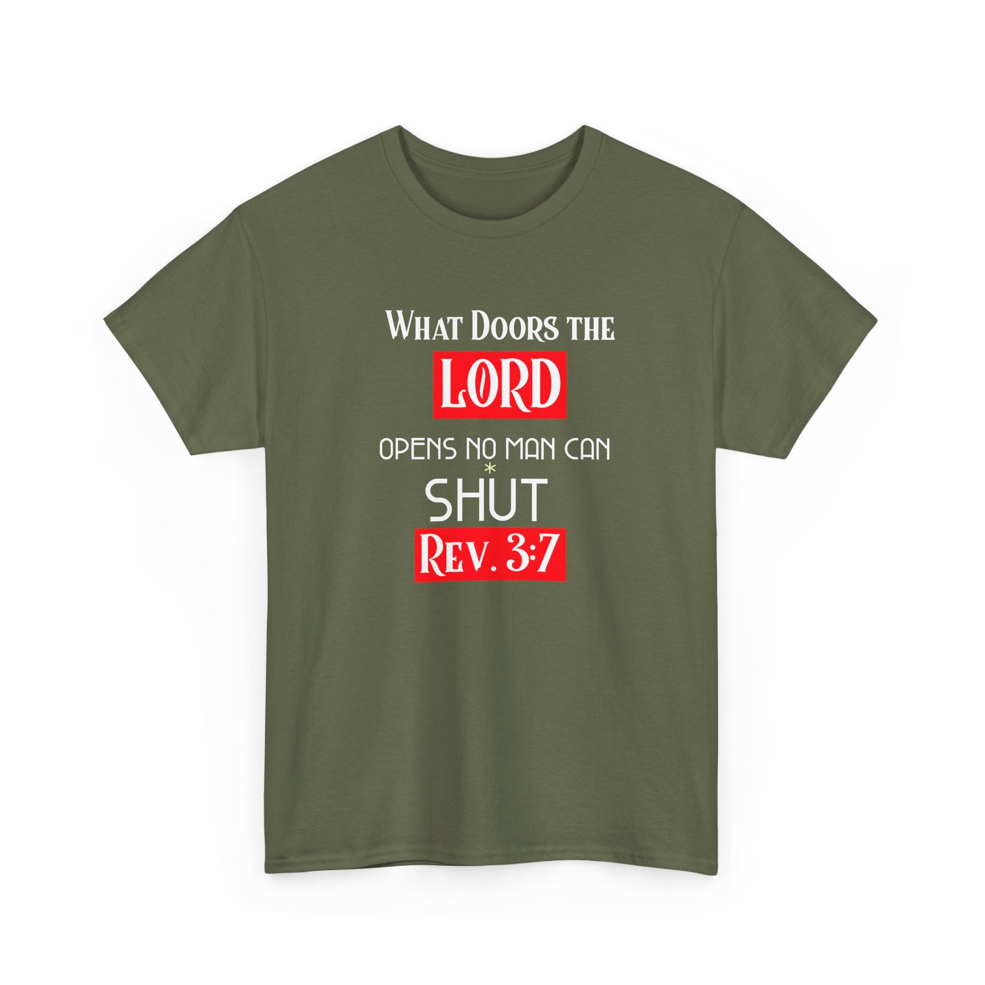 This tee features the phrase 'What door the LORD opens no man can shut' printed on a durable and smooth fabric, perfect for any wardrobe. The classic fit and crew neckline makes it suitable for any occasion, offering a comfy and timeless look. Ideal for anyone looking for a versatile and long-lasting shirt. Relevant for religious holidays and everyday wear.